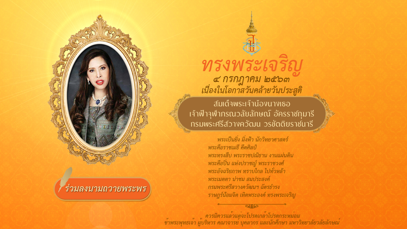 ขอเชิญร่วมพิธีถวายพระพรชัยมงคล เนื่องในโอกาสวันคล้ายวันประสูติ สมเด็จพระเจ้าน้องนางเธอ เจ้าฟ้าจุฬาภรณวลัยลักษณ์ อัครราชกุมารี กรมพระศรีสวางควัฒน วรขัตติยราชนารี ประจำปี 2563