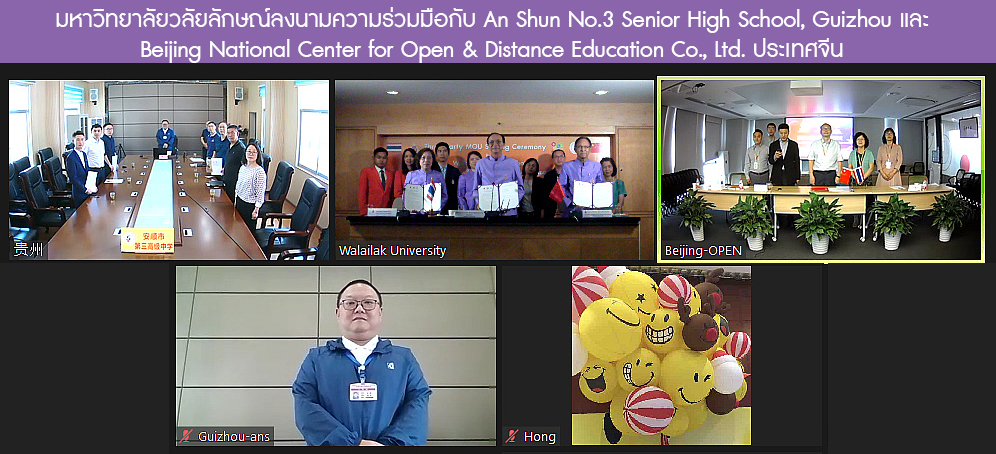 เมื่อวันที่ 23 กรกฎาคม 2563 มหาวิทยาลัยวลัยลักษณ์ ได้ลงนามความร่วมมือ MOU กับ An Shun No.3 Senior High School, Guizhou และ Beijing National Center for Open & Distance Education Co., Ltd. ประเทศจีน ผ่านระบบ online VOOV โดย An Shun No.3 Senior High School ลงนามจากจังหวัด Guizhou โดย Mr. Jiang Tao ผู้อำนวยการโรงเรียน  และฝ่าย Beijing National Center for Open & Distance Education Co., Ltd. ลงนามจากปักกิ่ง โดย Mr. Zhao Min, CEO เป็นผู้ลงนาม